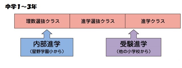 1年次に「内部進学」と「受験入学」の生徒を混ぜてクラス編成を行います。 「理数選抜クラス」「進学選抜クラス」「進学クラス」の授業はシラバスに沿って行われます。進度はどのコースでもほぼ同じですが、授業内容や達成目標などが異なります。(生徒の現状を踏まえ変更する場合もあります。)