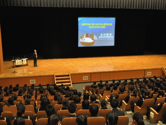 3月6日(水)に、大講堂で道徳講演会を行いました。今年は琉球大学教授の古川雅英先生をお招きして、「 地震列島に暮らすための基礎知識」−地球の科学と探検−というテ−マで講演していただきました。 講演の内容は@巨大地震・津波が起こる原因A放射線の影響B地球を知るための研究の楽しさについてでした。