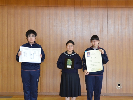 また、朝会に先立ち、3月30日に行われた「中学・高校囲碁級位認定大会Cクラス」3位および3月22日に行われた「第6回声楽アンサンブルコンテスト全国大会」優良賞の表彰がありました。