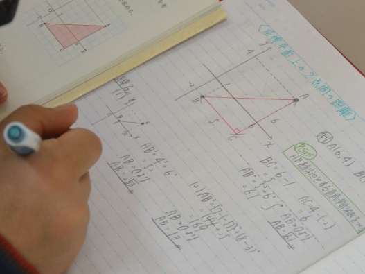 中学2年生の数学では、三平方の定理を学習しています。座標上の2点間の距離を三平方の定理を利用して求めています。