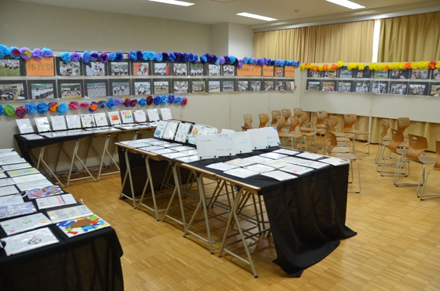 家庭科の授業で取り組んだ自分史絵本も展示。これまでの自身を振り返りながらまとめました。生徒が作成したスライドショーの映像も上映しました。