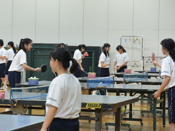 女子の卓球(第二体育館)。スマッシュやサーブを中心に練習しています。